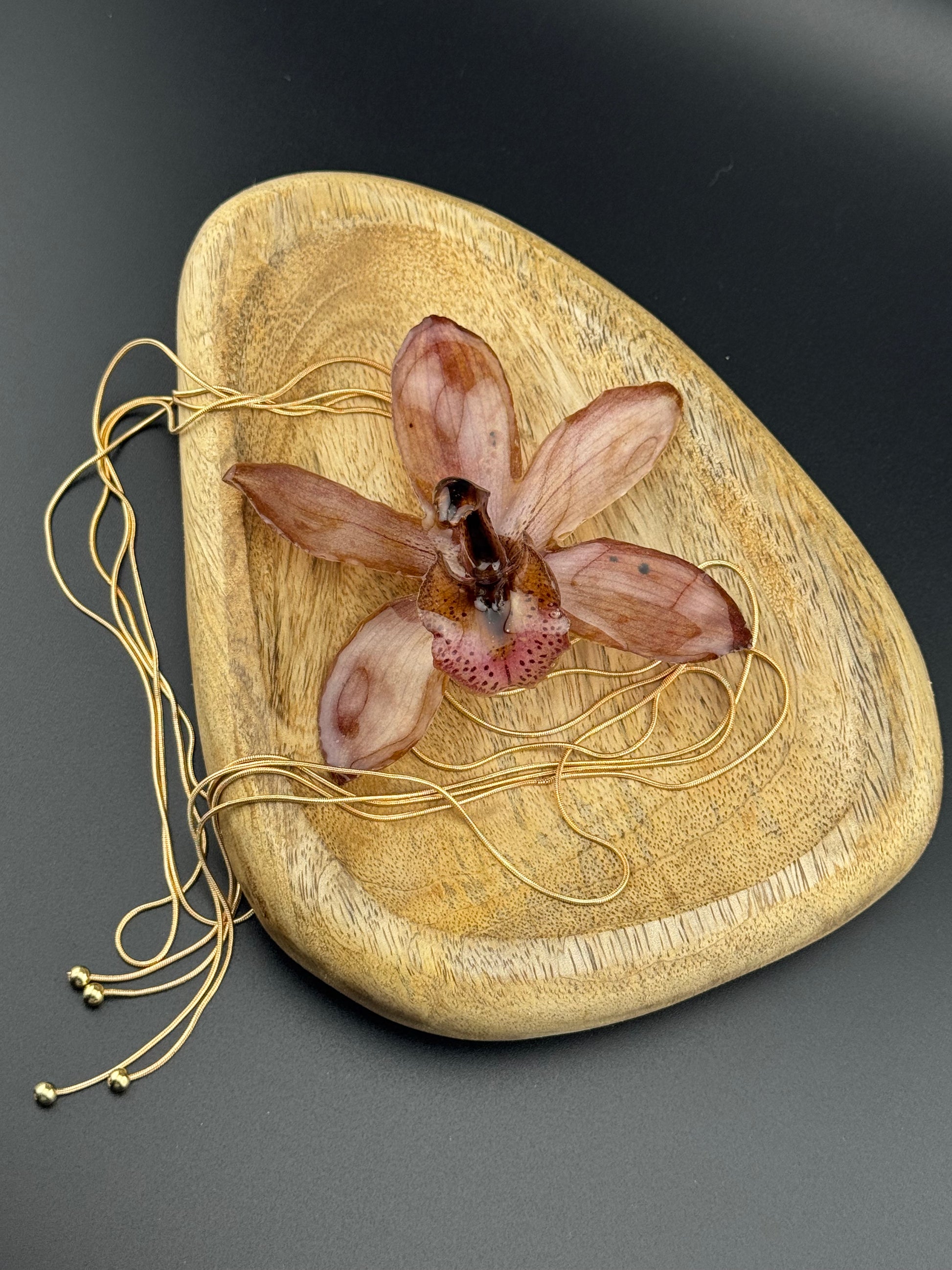 Diese außergewöhnliche Halskette vereint die zarte Schönheit einer echten, konservierten Orchideenblüte mit eleganten silberfarbenen Elementen. Die Blüte wurde sorgfältig getrocknet und in hochwertigem UV-Harz konserviert, um ihre natürliche Struktur und Anmut dauerhaft zu bewahren.